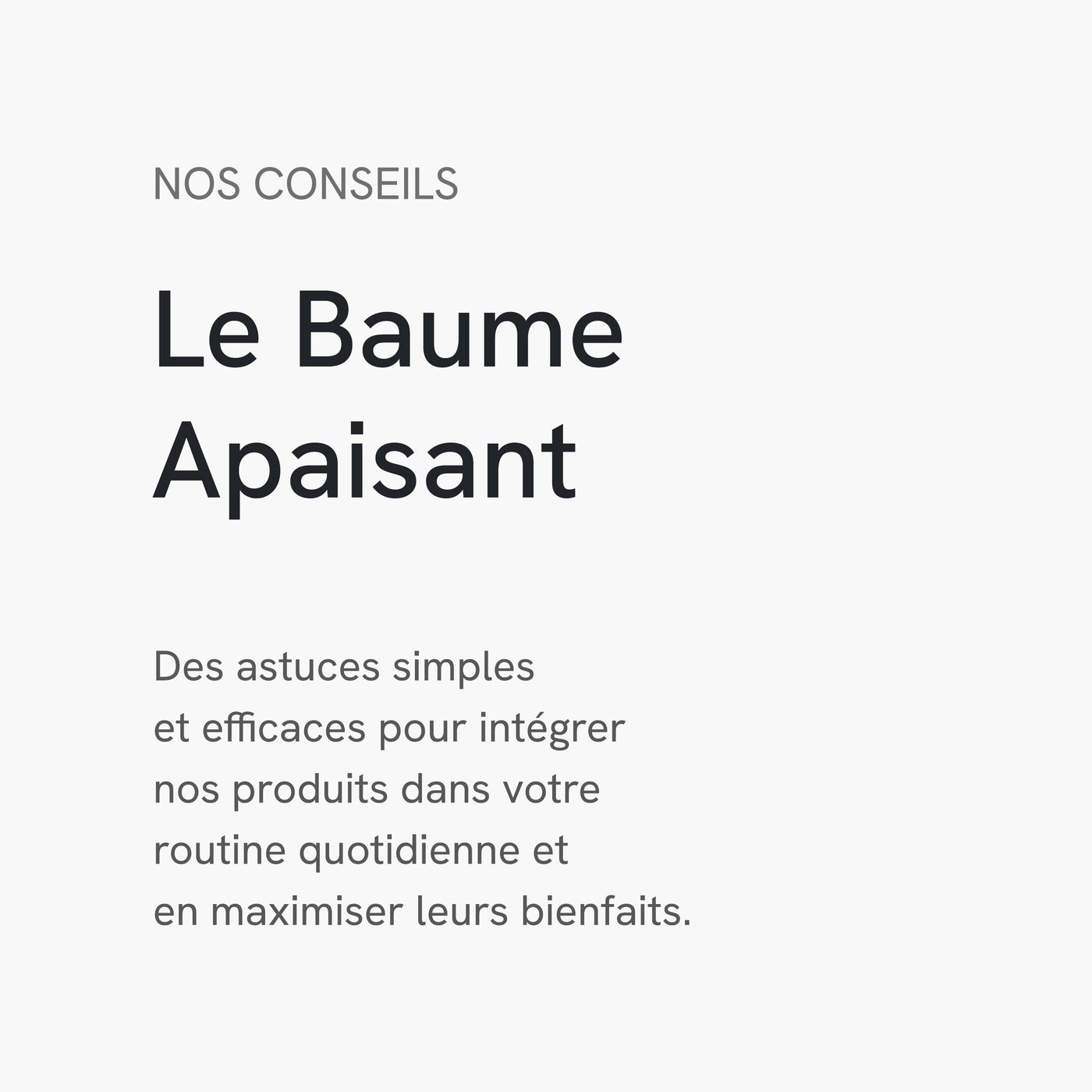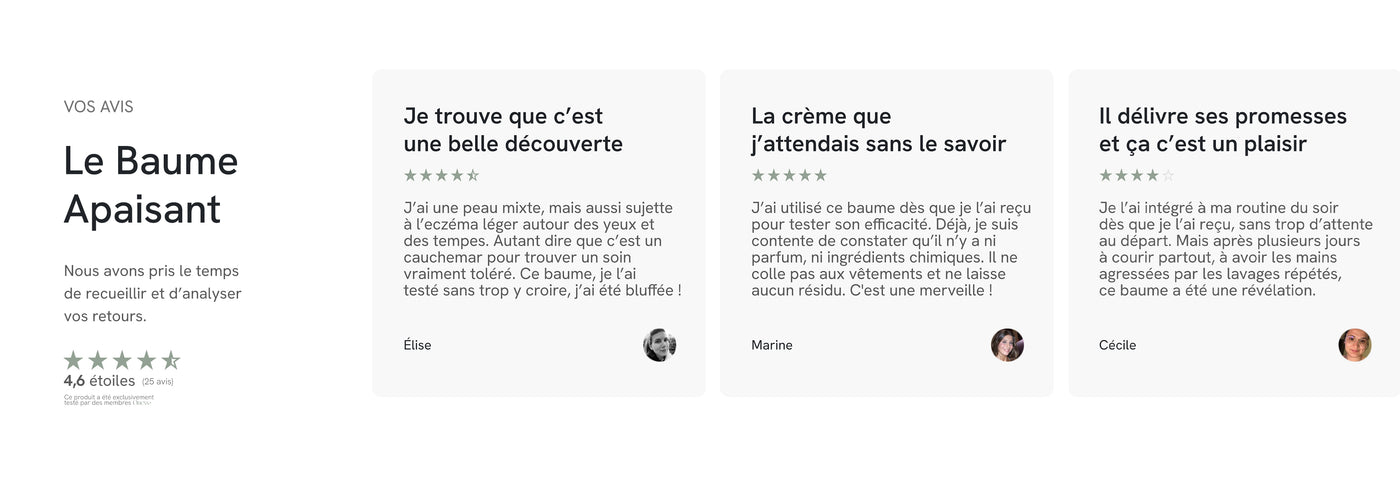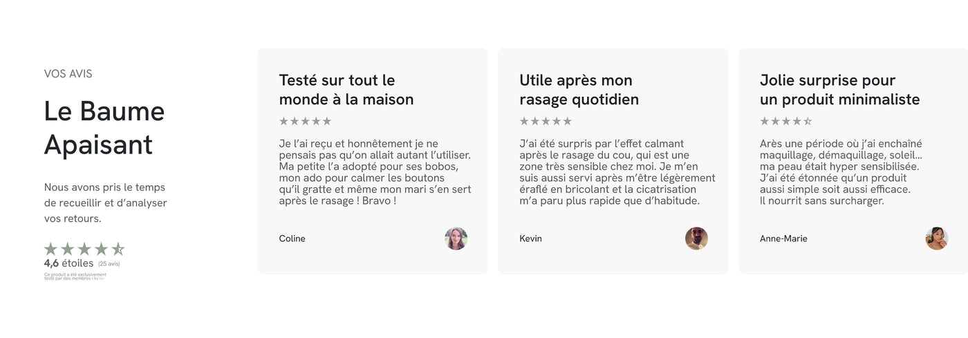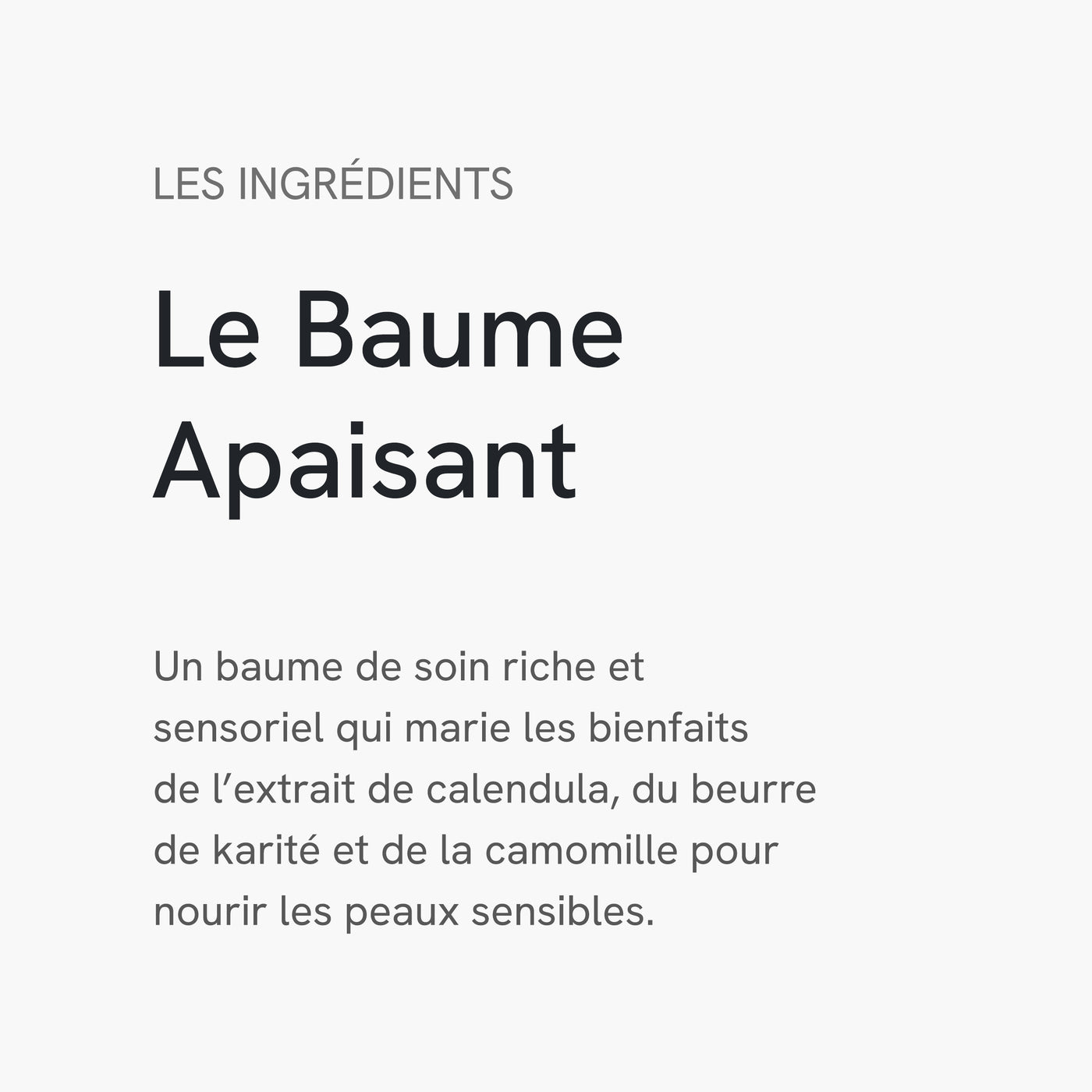 Contrairement aux baumes classiques souvent alourdissants ou parfumés à l’excès, L’Apaisant mise sur l’efficacité pure et la douceur absolue. Il répond aux besoins des peaux les plus exigeantes, avec une formule rassurante, polyvalente et profondément réparatrice. Résultat : une peau apaisée, protégée et durablement réconfortée.