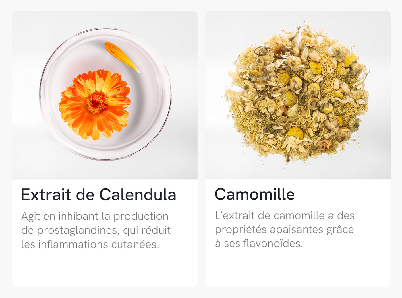 La camomille est un actif phare des peaux sensibles. Son extrait contient du bisabolol et des flavonoïdes aux propriétés apaisantes, anti-irritantes et adoucissantes. Elle calme rapidement les rougeurs, démangeaisons et petites inflammations cutanées.
