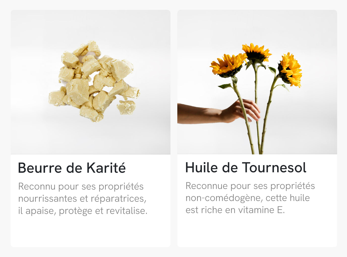 Le beurre de karité et l’huile de tournesol favorisent la régénération cellulaire et participent activement à la réparation de la barrière cutanée. Ils aident la peau à se remettre plus rapidement des agressions, égratignures, sécheresses sévères ou petits bobos du quotidien.