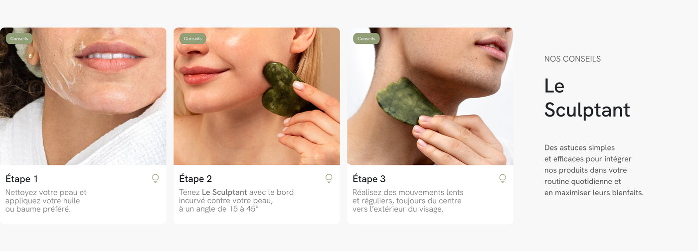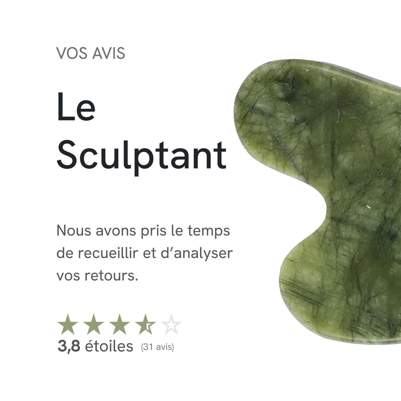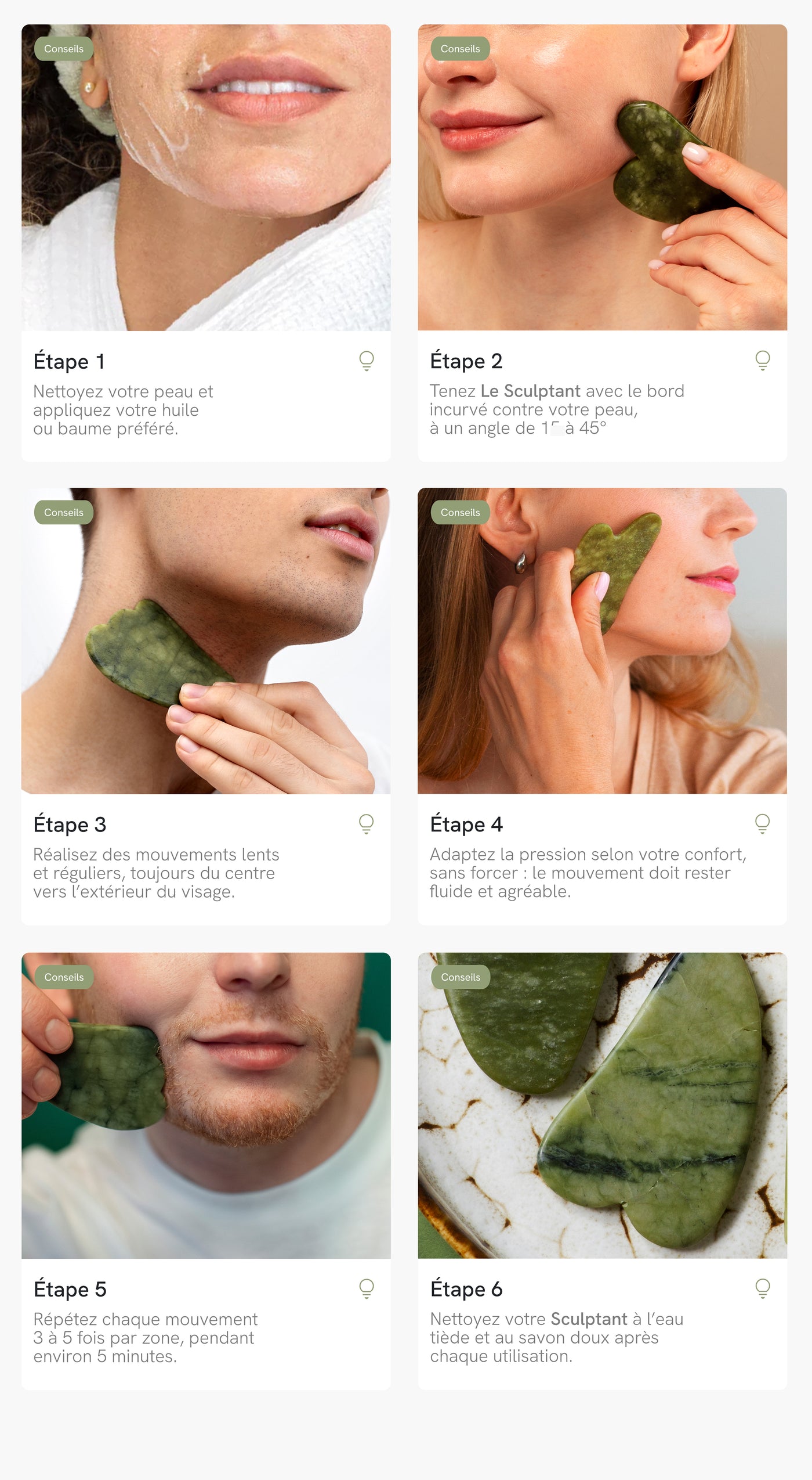 Contrairement aux massages manuels classiques, Le Sculptant agit en profondeur grâce à la forme ergonomique du gua sha, qui épouse parfaitement les courbes du visage pour un effet liftant visible dès les premières utilisations.