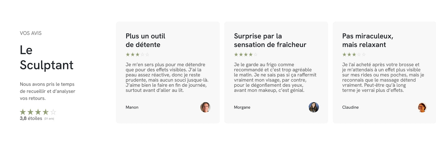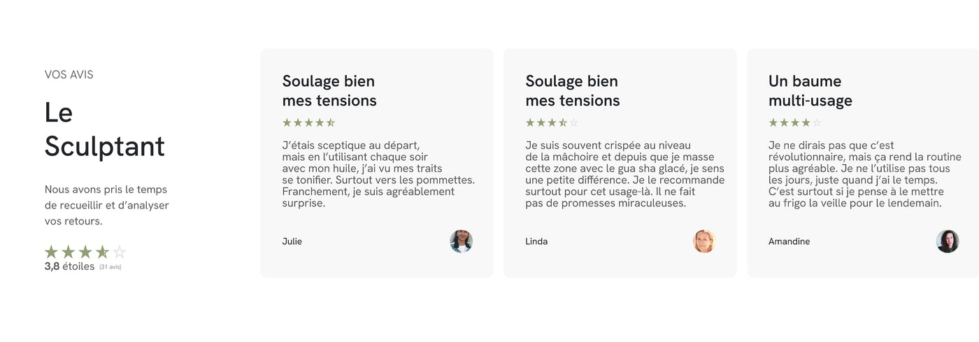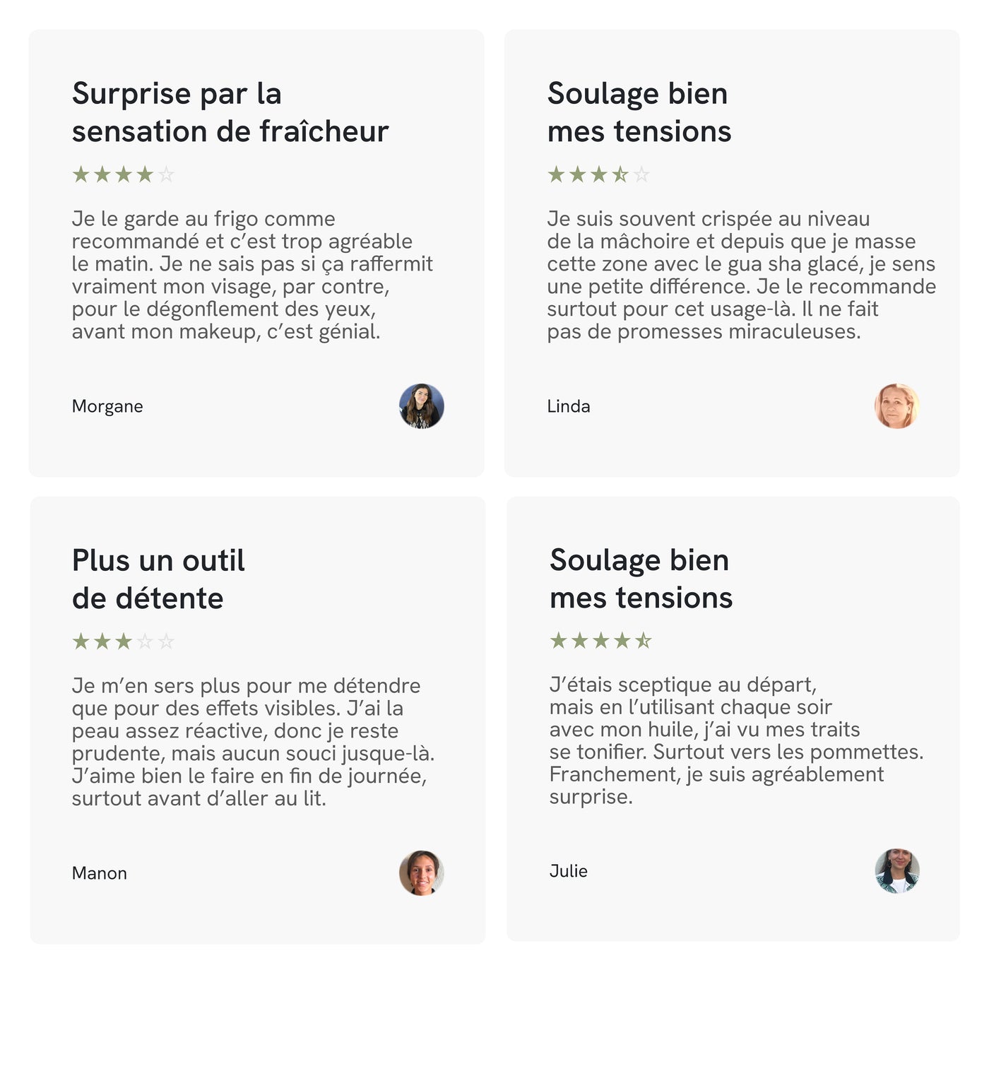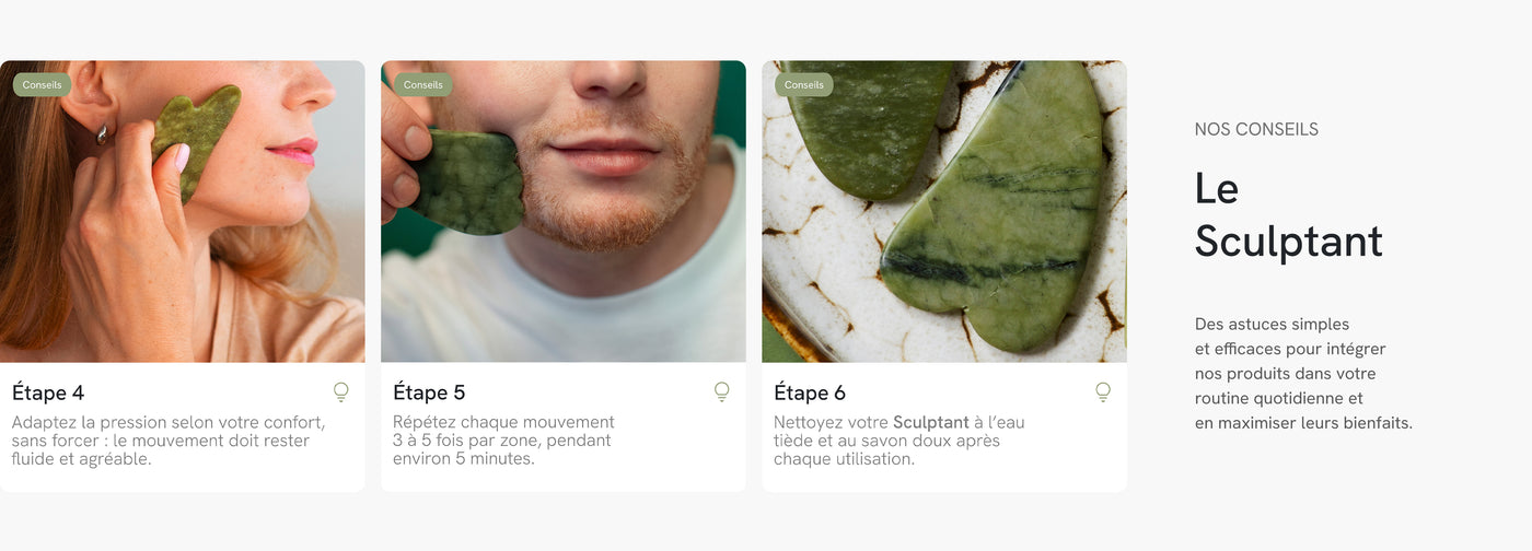 Contrairement aux massages manuels classiques, Le Sculptant agit en profondeur grâce à la forme ergonomique du gua sha, qui épouse parfaitement les courbes du visage pour un effet liftant visible dès les premières utilisations.