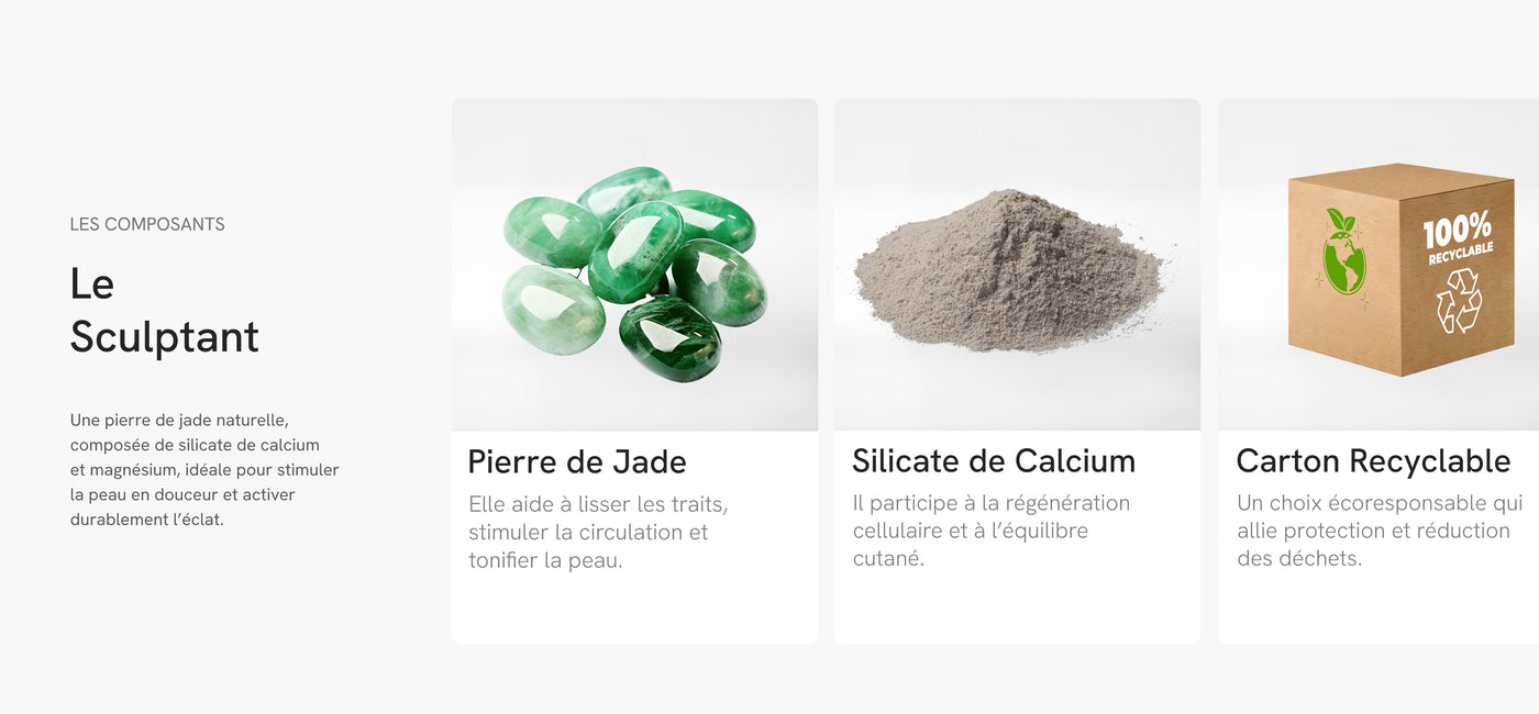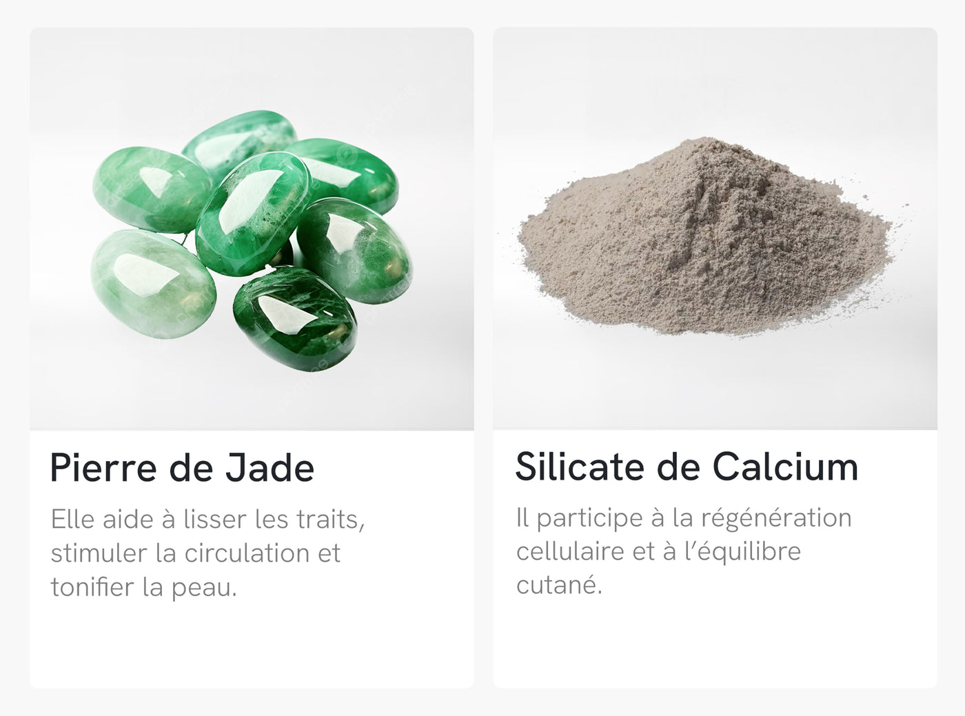 Pierre semi-précieuse ancestrale, la jade est connue pour ses vertus apaisantes et régénérantes. Riche en minéraux, elle est utilisée depuis des siècles dans les rituels de beauté asiatiques pour ses effets tonifiants, drainants et énergétiques.